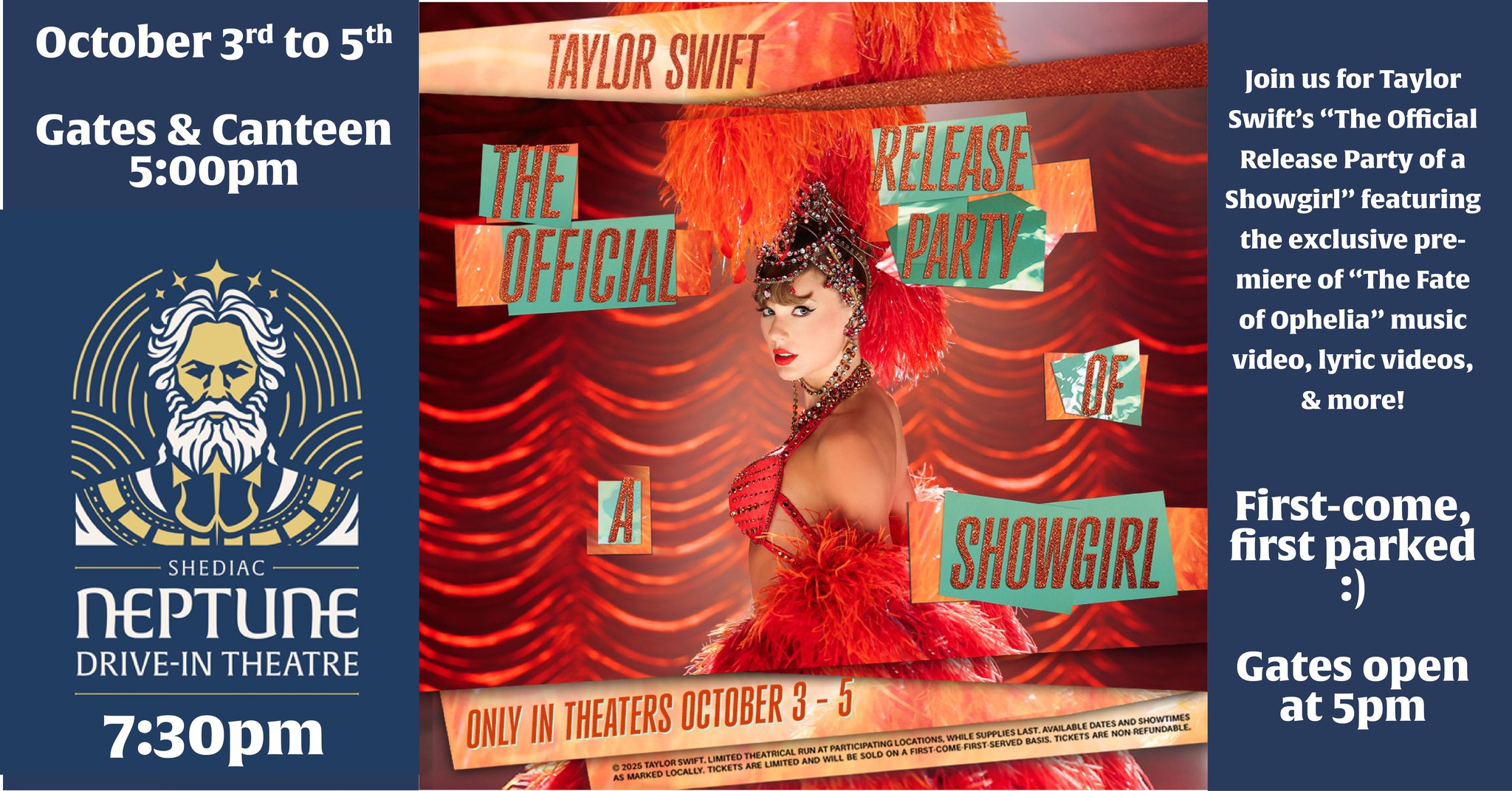 Celebrate The Official Release Party of a Showgirl at The Neptune Drive-In! Sing & dance along with Taylor and see the exclusive world premiere of the music video, “The Fate of Ophelia”, along with behind-the-scenes footage, brand new lyric videos, and Taylor’s personal reflections!