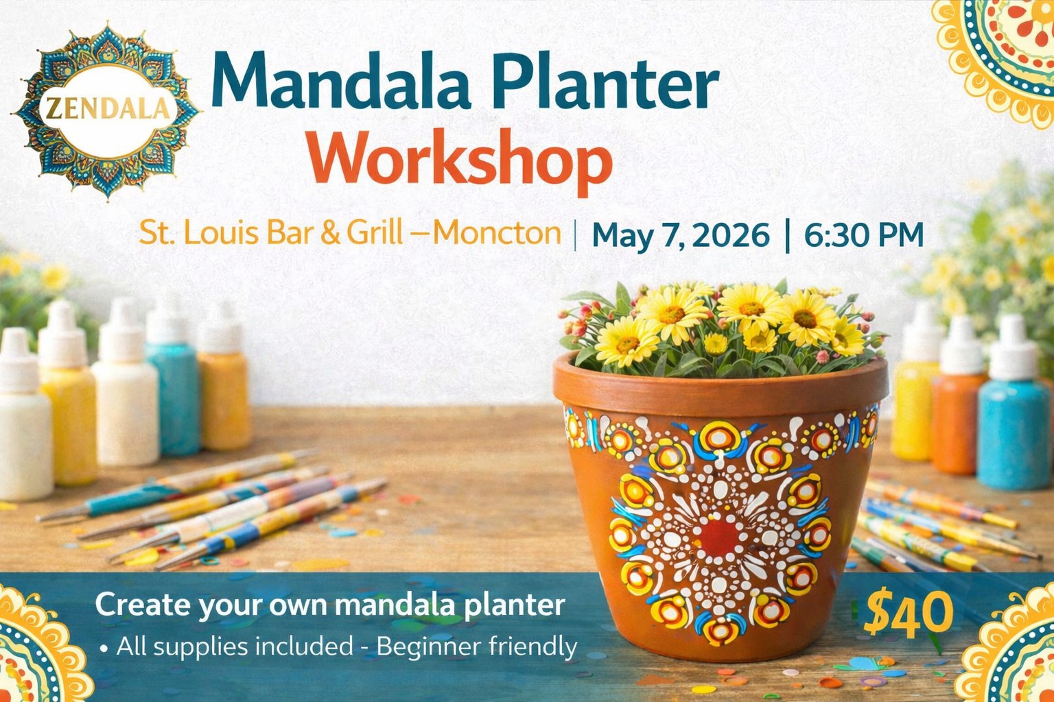 Create your own beautifully painted mandala flower pot using relaxing dot art techniques. This workshop is beginner-friendly and all supplies are included.