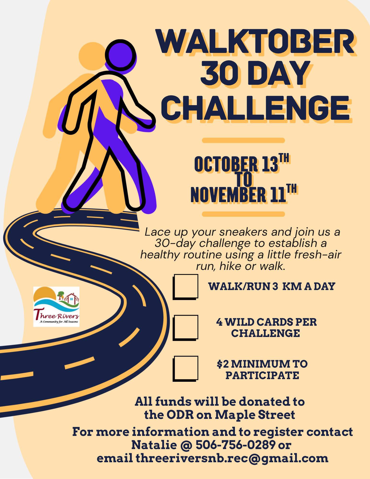 Payment can be made by etransfer to office@threeriversnb.ca. Please place your name and Walkober Challenge in the memo.