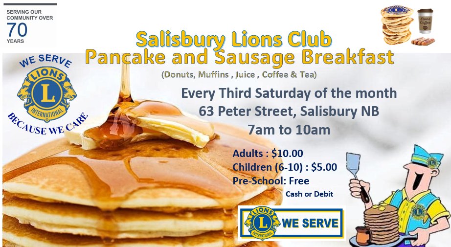 Event by Salisbury Lions Club Salisbury Lions Club 63 Peter Street Salisbury New Brunswick Duration: 3 hr Saturday February 21st is our Lions Club Pancake and Sausage Breakfast (Donuts, Muffins , Juice , Coffee & Tea) ... Hope to see you there .. 63 Peter Street Salisbury NB Remember there is plenty of parking in rear parking lot of building. Adults : $10.00Children (6-10) : $5.00Pre-School: FreeCash or Debit All funds raised go back into the community helping our Lions Serve…