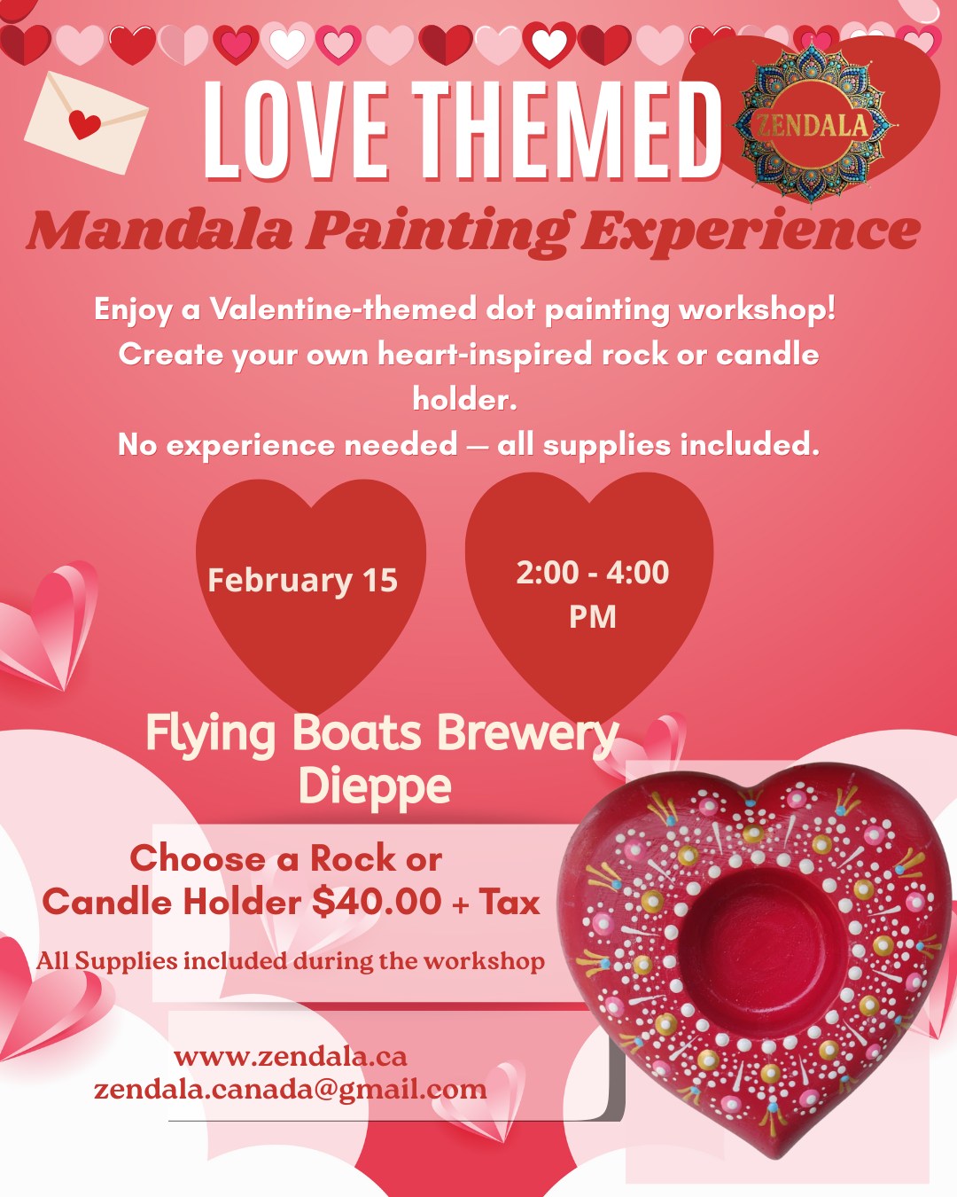 Event by Zendala Canada 700 Malenfant Blvd, Dieppe, Flying Boats Brewery Discover the joy of dot painting with a romantic twist! Whether you’re planning a cozy Valentine’s date or a fun Galentine’s gathering with friends, this creative workshop is all about love. Simple to learn and soothing to create, heart‑inspired mandala designs bring warmth, calm, and a splash of creativity to your celebration. Book your Spot today! WWW.zendala.ca